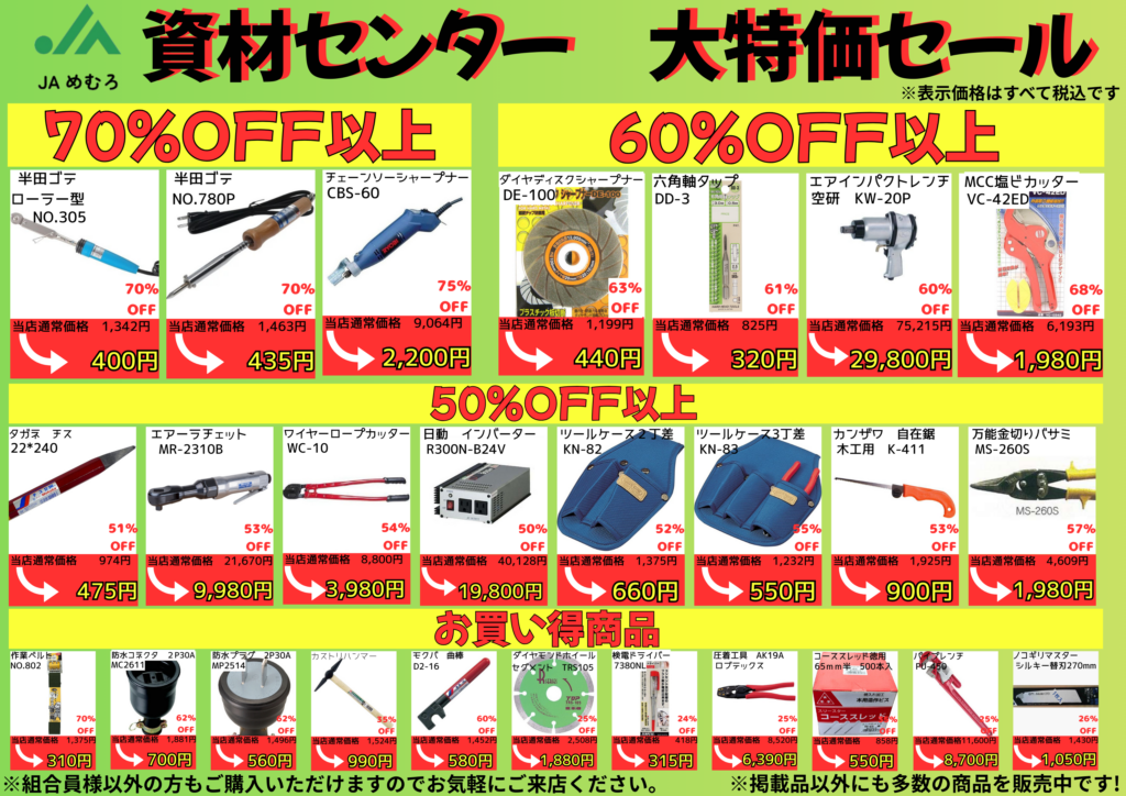 News 新着情報 ホーム 重要なお知らせ 資材センター 大特価セール 2026.02.03重要なお知らせ 資材センター 大特価セール セールを開催いたします! 数量に限りがございますので、お早めの来店をおすすめいたします! 一覧をみる