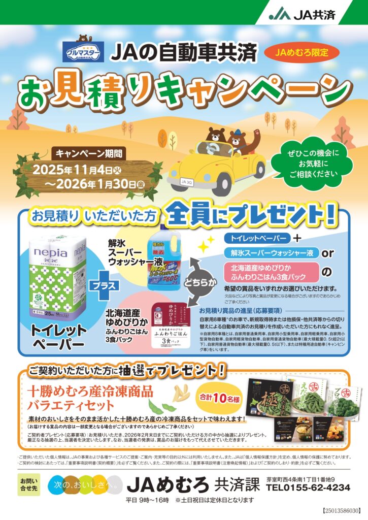 JAめむろでJAの自動車共済のお見積りをすると、もれなく『トイレットペーパー+ウォッシャー液かレトルトごはんのいずれか希望の賞品』をプレゼント!