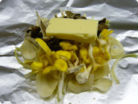 クッキングホイルに1、2の材料を置き、塩、こしょうを振り、バターをたっぷりのせます。 |