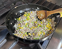 油をひいたフライパンで香りが出るまで刻んだにんにくを炒め、玉ねぎ、スイートコーン、えだまめ(冷凍のままでOK)を入れます。 | |