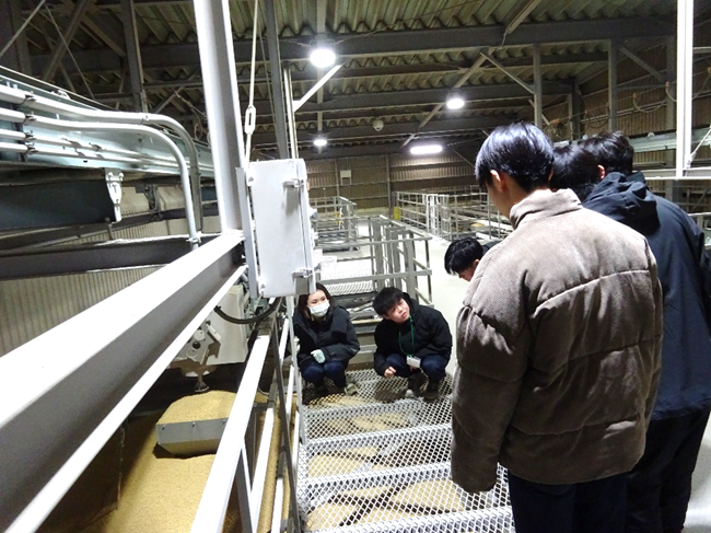 施設見学では農産物調製施設を見学し、大豆の調整の様子や貯蔵庫の中を見ることができました。参加した学生からは、「芽室町農業の規模の大きさに驚いた。」、「大豆や小豆など細かく品種が分かれていることを初めて